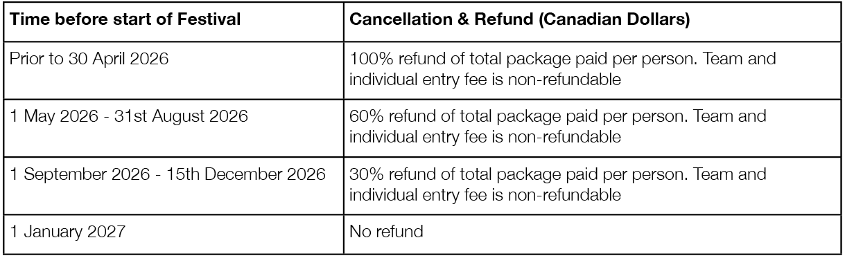 Any amendment made to the booking within 60 days of the commencement of the festival may incur an amendment fee of CAD$100. per amendment per person, in addition to any fees charged by suppliers.
